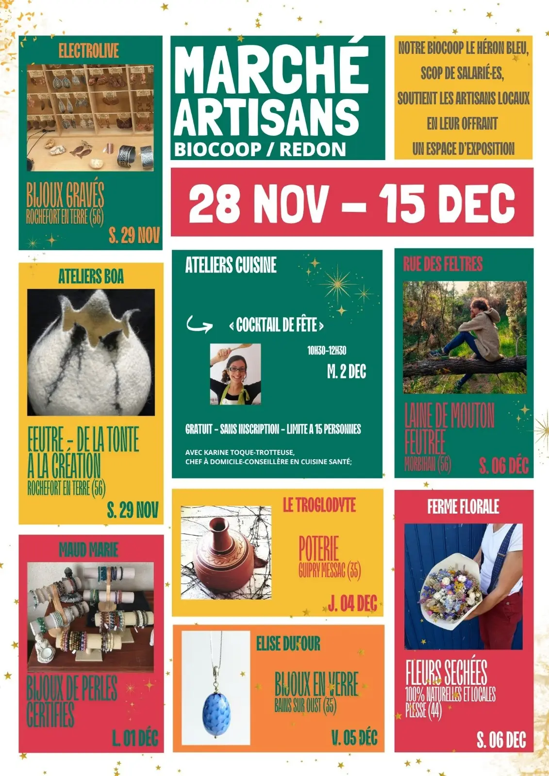 Mardi 2 déc. → Atelier cuisine : "Cocktail de fêtes" (10h30–12h30) – Animé par Karine, Toque-Trotteuse, cheffe à domicile et conseillère en cuisine santé