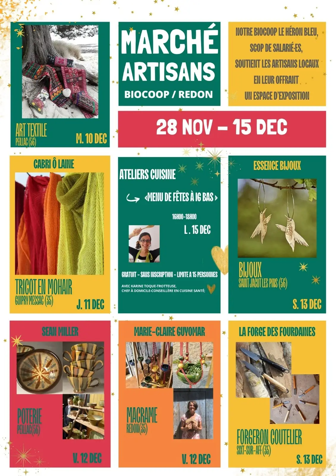 Lundi 15 déc. → Atelier cuisine : "Menu de fête à IG bas" (16h–18h) – Animé par Karine, Toque-Trotteuse, cheffe à domicile et conseillère en cuisine santé